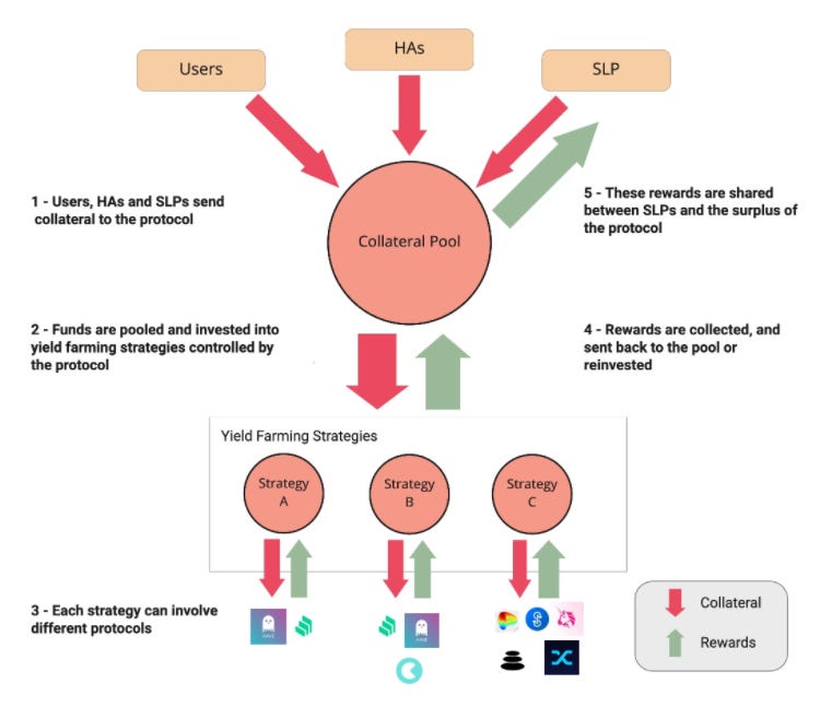 An exciting characteristic of this setup is that SLPs generate income from their liquidity and liquidity provided by hedging agents and stable seekers, causing a multiplier effect on the SLP’s yields.