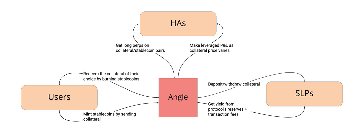 Hedging agents are vital in increasing Angle Protocol’s capital efficiency and allow the protocol to transfer the collateral’s volatility to external third parties looking for leveraged exposure. Combined with liquidity from SLPs acting as a backstop, this leveraged exposure allows the system to maintain a 1:1 stablecoin to collateral parity.