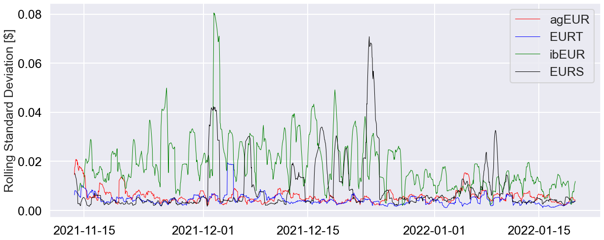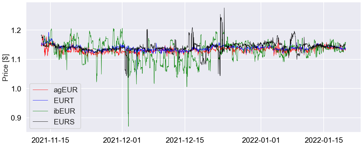 Prices derived from Coingecko suggest agEUR to have a more stable price than its counterparts.
