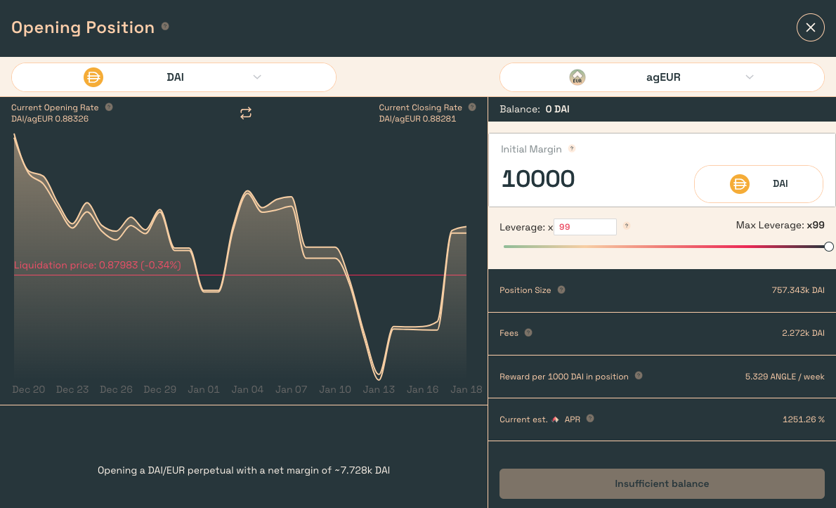 A stable seeker wants to mint agEUR by depositing any whitelisted collateral options. The protocol now has a certain amount of collateral (say, DAI) that backs the minted agEUR. The protocol’s lack of funding rates attracts users who want to be long volatility between DAI/agEUR using excessive leverage by just paying a single transaction fee. Say a hedging agent brings in their collateral and leverages their DAI/agEUR position by a certain amount (within limits such that the protocol is solvent),