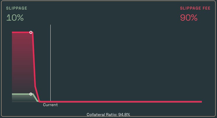 In the case of the protocol reaching under-collateralisation, the liquidity provided by an SLP ensures 1:1 redeemability. Should an SLP choose to remove their liquidity in such circumstances, they would incur a slippage. The protocol’s C-ratio governs the slippage parameter: