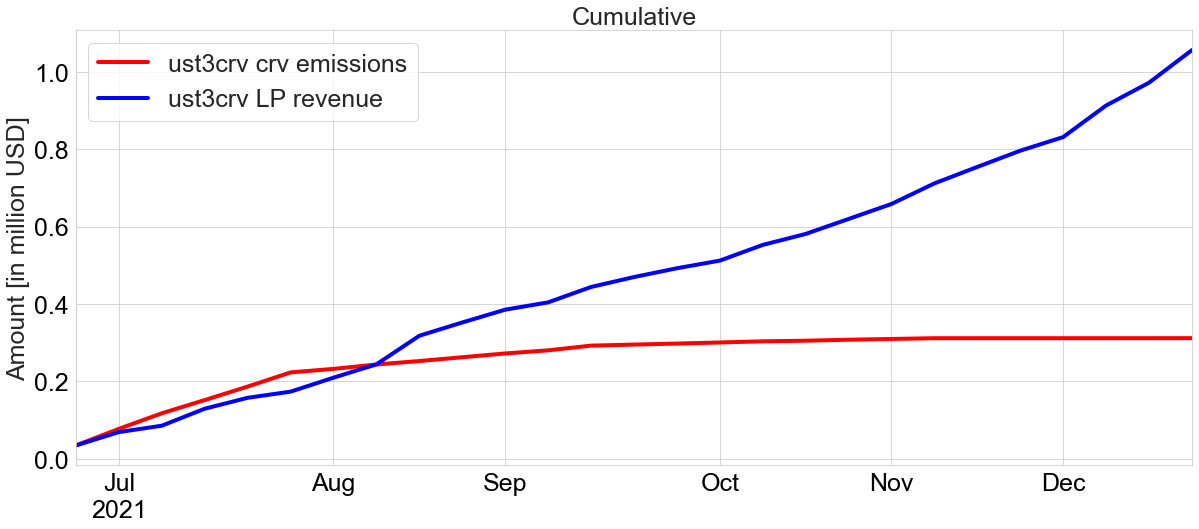We focus on the first 3 pools, since that’s where most of the trading activity takes place. Total CRV in USD emitted to these three pools is 15.55 million (as of 23rd December 2021), while the revenue generated is 3.37 million USD combined. The pool has a low revenue/emissions ratio, owing to their participation in gauge-bribing, which attracts vast amounts of liquidity for large amounts of CRV emissions.